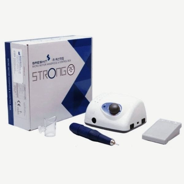 سوهان برقی Strong 210 یکی از پر فروشترین دستگاههای سوهان برقی نزد ناخن کارها می باشد که دارای یکی از بهترین و قدرتمندترین موتورهای سوهان برقی است. دسته اصلی سوهان برقی Strong 210 از دور موتور 35000 دور بهره میبرد که به هنگام کار با دور موتور 35000 متوجه لرزش و صدای بسیار کم آن میشوید. از سوهان برقی Strong 210 هم میتوان با پدال و هم به صورت دستی استفاده کرد. بر روی سوهان برقی Strong 210 کلیدی تعبیه شده است که با استفاده از این کلید شما میتوانید بین برق 220 ولت و 110 ولت سوئیچ کنید. هندپیس این دستگاه قابلیت استفاده در دو جهت چپ و راست را دارا میباشد نکتهای که در تغییر جهت گردش دستگاه باید به آن توجه نمایید 210 این است که در هنگام کار جهت گردش را تغییر ندهید، ابتدا دور موتور را صفر کنید و سپس دور موتور را بالا ببرید، این کار باعث می شود به بلبرینگهای سوهان برقی آسیب وارد نشود.