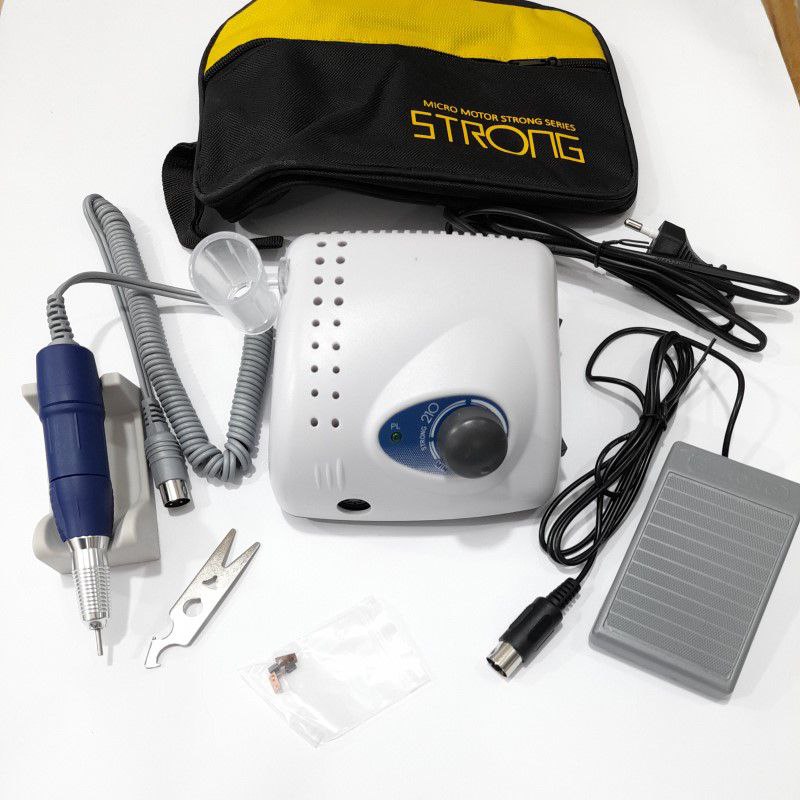 سوهان برقی Strong 210 یکی از پر فروشترین دستگاههای سوهان برقی نزد ناخن کارها می باشد که دارای یکی از بهترین و قدرتمندترین موتورهای سوهان برقی است. دسته اصلی سوهان برقی Strong 210 از دور موتور 35000 دور بهره میبرد که به هنگام کار با دور موتور 35000 متوجه لرزش و صدای بسیار کم آن میشوید. از سوهان برقی Strong 210 هم میتوان با پدال و هم به صورت دستی استفاده کرد. بر روی سوهان برقی Strong 210 کلیدی تعبیه شده است که با استفاده از این کلید شما میتوانید بین برق 220 ولت و 110 ولت سوئیچ کنید. هندپیس این دستگاه قابلیت استفاده در دو جهت چپ و راست را دارا میباشد نکتهای که در تغییر جهت گردش دستگاه باید به آن توجه نمایید 210 این است که در هنگام کار جهت گردش را تغییر ندهید، ابتدا دور موتور را صفر کنید و سپس دور موتور را بالا ببرید، این کار باعث می شود به بلبرینگهای سوهان برقی آسیب وارد نشود.